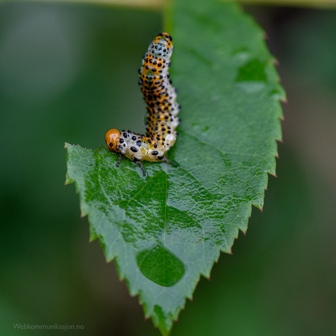 Larver av rosebladveps inntar et bedre måltid. Larvene holdt til på rosebusken ‘Lady of Shalott’ i hagen vår på Lørenskog. Selve bildet er tatt ved at jeg plasserte blader og larver på et speil. Larvene er ca 1 cm store. Bildet er tatt med Nikon D750 og Nikkor 105mm 2.8 makroobjektiv.