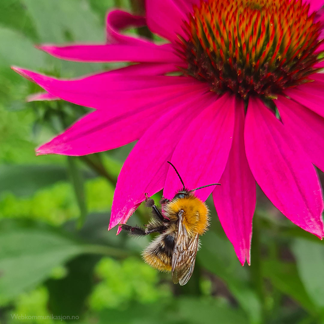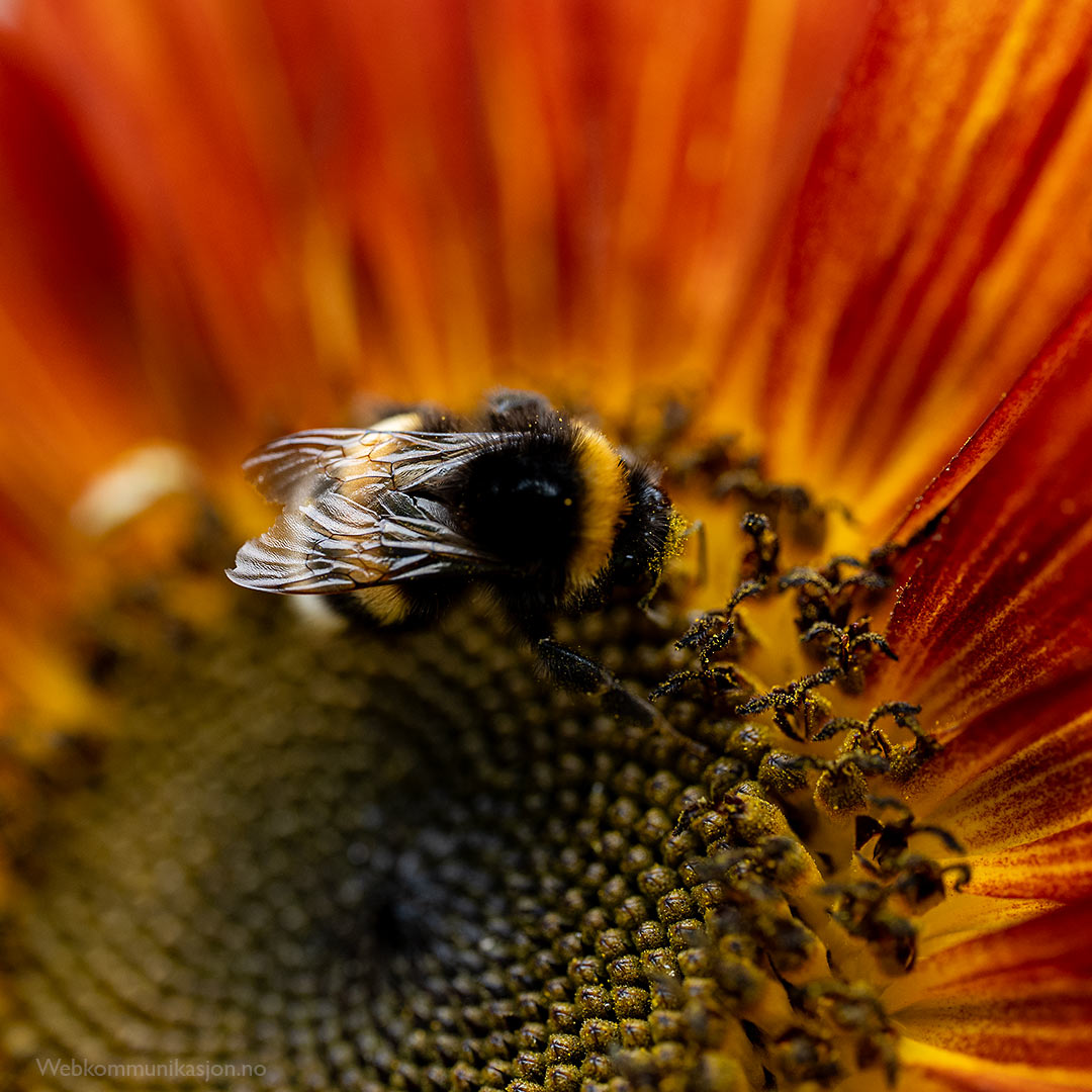 Humle på en blomst i solsikkefamilien i vår hage i Lørenskog.